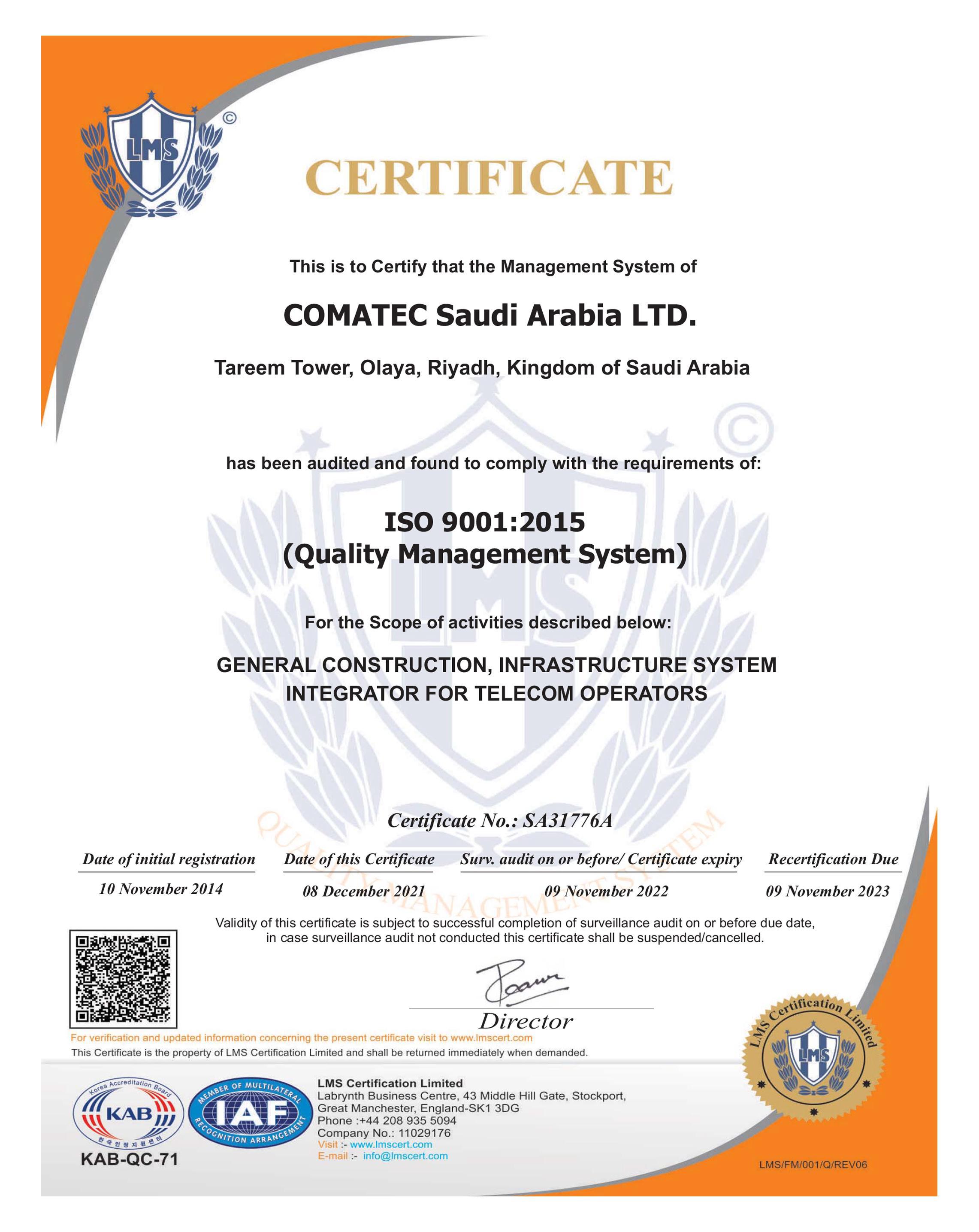 We are certified according to the ISO 9001: 2015 System Standard as part of the confirmation of the quality of our products and services that we provide to our customers for the scope of General Construction, and Infrastructure System Integrator for Telecom Operators